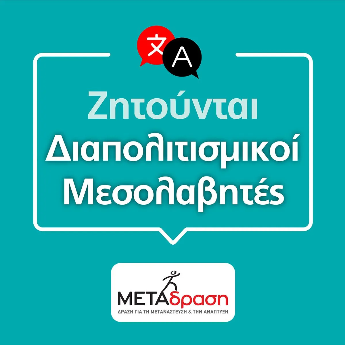 Η ΜΕΤΑδραση προκηρύσσει θέσεις εργασίας στο πλαίσιο υλοποίησης της Πράξης από την Οργάνωση με τίτλο “Παροχή υπηρεσιών διαπολιτισμικής μεσολάβησης σε υπηρεσίες υγείας στην Περιφέρεια Νοτίου Αιγαίου”, στο Πρόγραμμα «Νότιο Αιγαίο» 2021-2027 και στην Προτεραιότητα «Ανθρώπινο Δυναμικό και κοινωνική ένταξη». Το ανωτέρω έργο συγχρηματοδοτείται από το Ευρωπαϊκό Κοινωνικό Ταμείο (ΕΚΤ+).